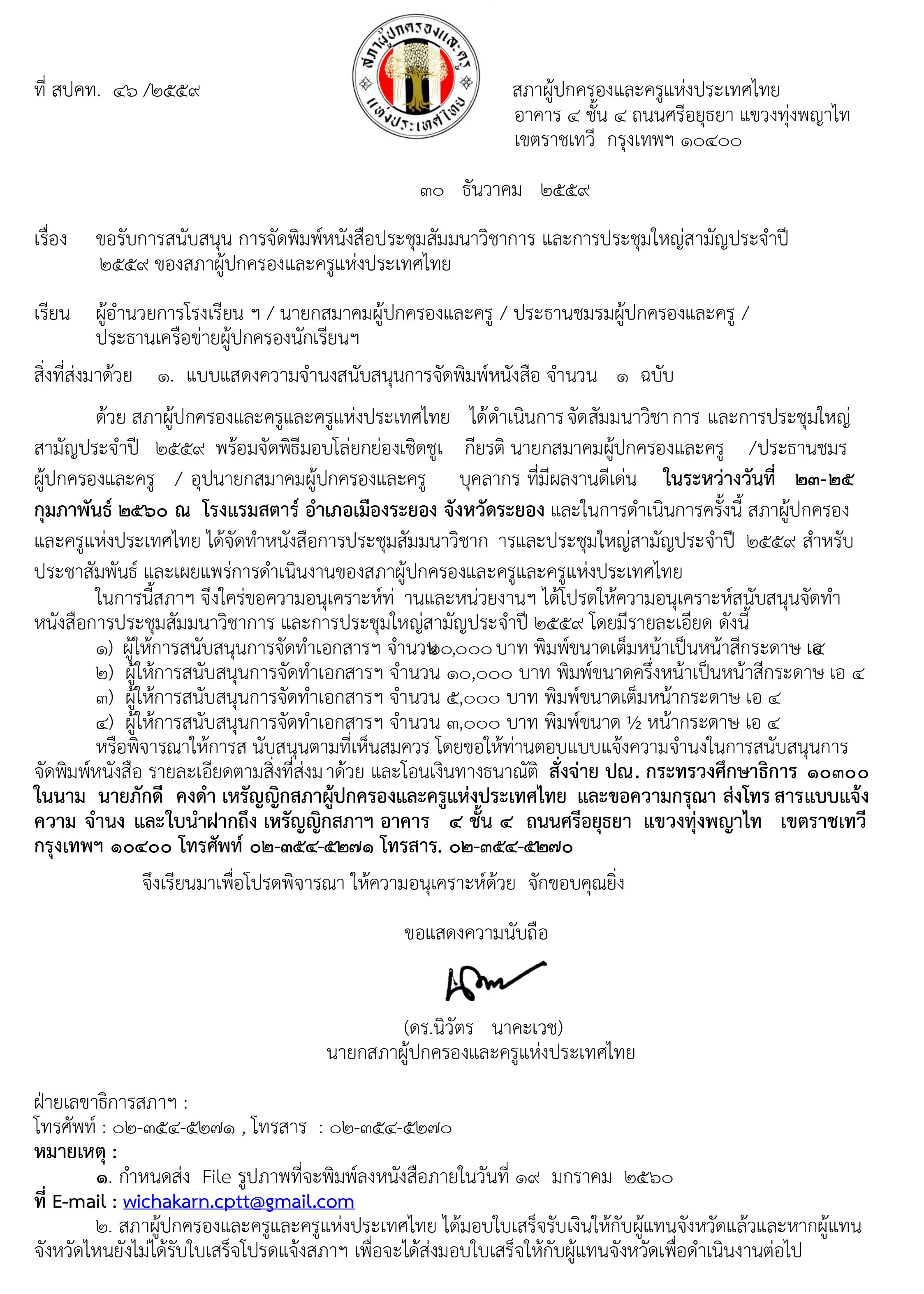 ด้วย สภาผู้ปกครองและครูและครูแห่งประเทศไทย ได้ดาเนินการจัดสัมมนาวิชาการ และการประชุมใหญ่สามัญประจาปี 2559 พร้อมจัดพิธีมอบโล่ยกย่องเชิดชูเกียรติ นายกสมาคมผู้ปกครองและครู/ประธานชมรผู้ปกครองและครู / อุปนายกสมาคมผู้ปกครองและครู บุคลากรที่มีผลงานดีเด่น ในระหว่างวันที่ 23-25 กุมภาพันธ์ 2560 ณ โรงแรมสตาร์ อาเภอเมืองระยอง จังหวัดระยอง และในการดาเนินการครั้งนี้ สภาผู้ปกครองและครูแห่งประเทศไทยได้จัดทาหนังสือการประชุมสัมมนาวิชาการและประชุมใหญ่สามัญประจาปี 2559 สาหรับประชาสัมพันธ์ และเผยแพร่การดาเนินงานของสภาผู้ปกครองและครูและครูแห่งประเทศไทย