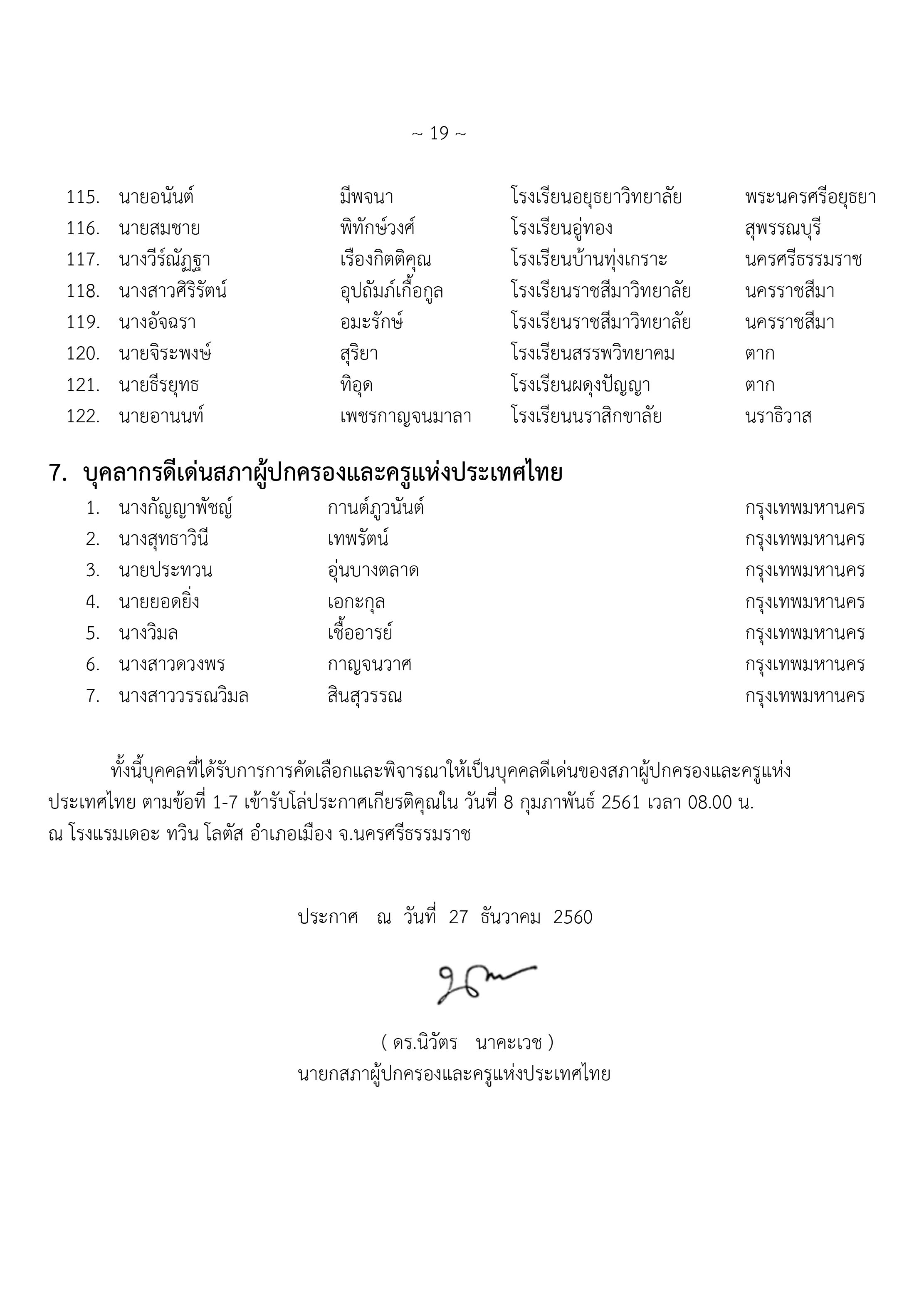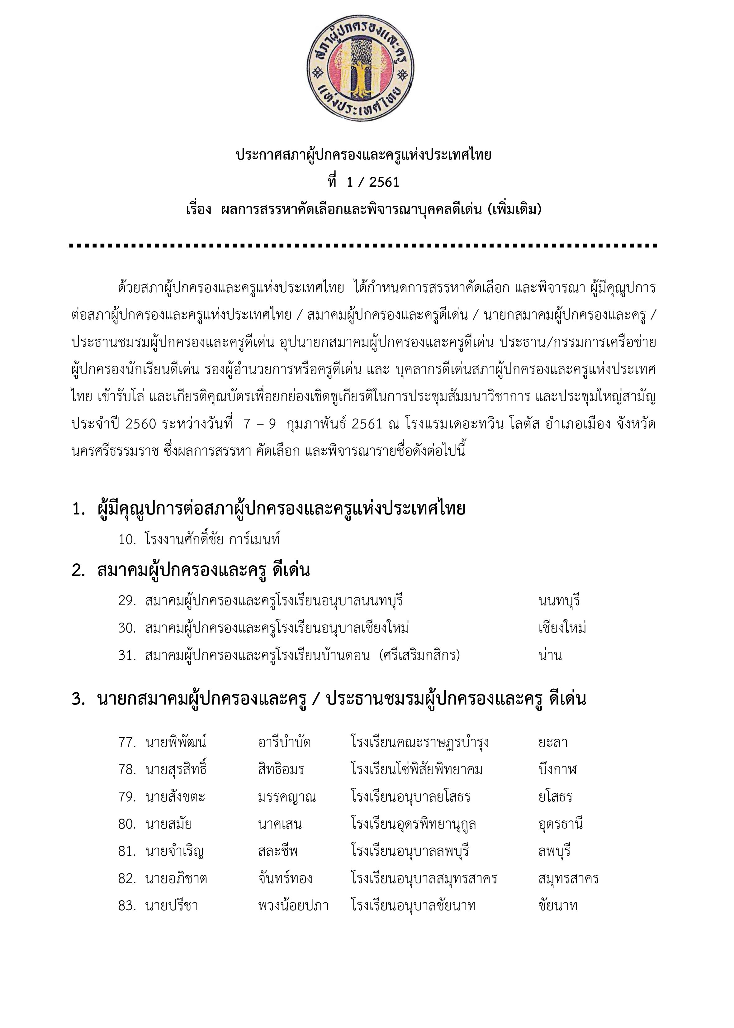 สภาผู้ปกครองและครูแห่งประเทศไทย. ประกาศผลการคัดเลือกสมาคมฯ และบุคคลดีเด่นประจำปี 2560